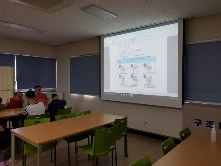 2018년 8월 14일 오후 2시에 입주자를 대상으로 건광관리 교육을 진행하였습니다. 교육내용은 약 복용과 관련된 내용을 시작으로 올바른 손 씻기와 손 소독제 사용 방법 등을 배우는 시간을 가졌습니다.