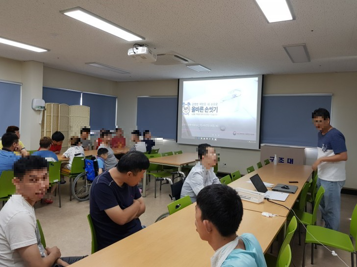 2018년 8월 14일 오후 2시에 입주자를 대상으로 건광관리 교육을 진행하였습니다. 교육내용은 약 복용과 관련된 내용을 시작으로 올바른 손 씻기와 손 소독제 사용 방법 등을 배우는 시간을 가졌습니다.