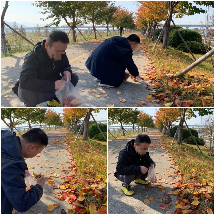 어릴때 추억 속에 낙엽을 책갈피에 끼어두거나 코팅지를 붙여 보관했던 기억이 나는데 낙엽줍기를 하는 입주자분들을 보면서 잠시나마 옛 추억을 떠올려 봅니다 ^^