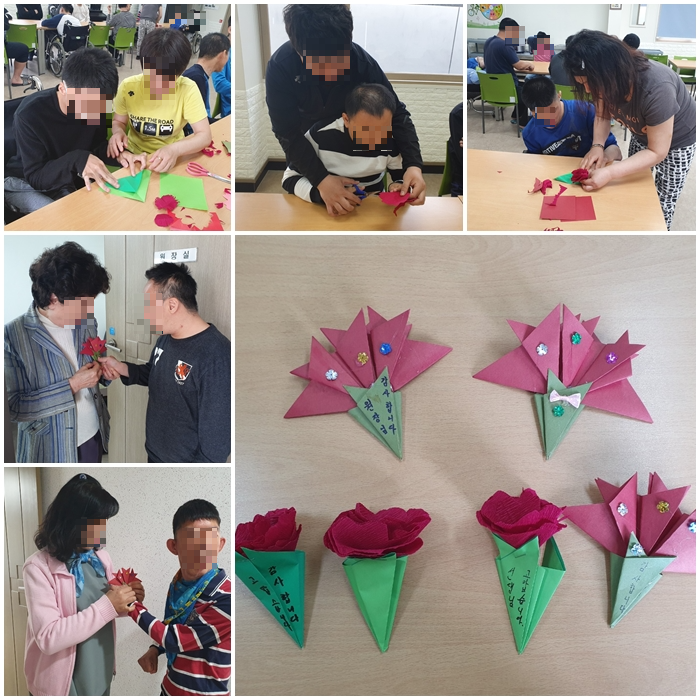 카네이션을 만들고 나서는 원장님을 비롯하여 여러 선생님들에게 카네이션을 달아주는 시간도 가져보았는데, 보는 것만으로도 왠지 뭉클한 기분이 들었습니다. 입주자와 함께 만들어본 카네이션 어떤가요? ^^