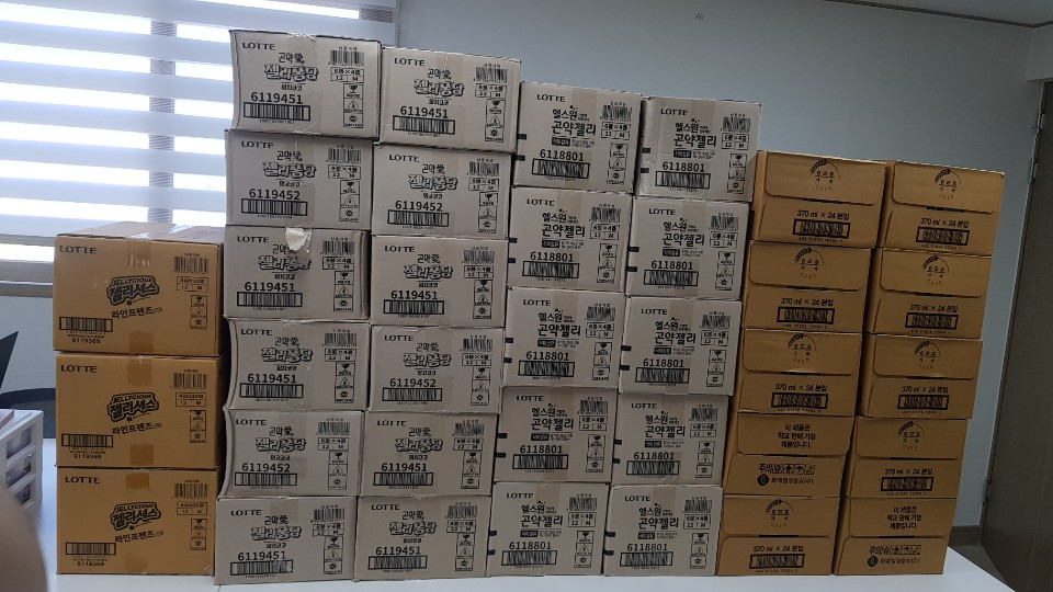 강서구 둥지 푸드마켓에서 젤리셔스 3박스, 젤리퐁당 22박스, 곤약젤리 10박스, 오르조 가바 음료 10 박스를 후원해주셨습니다. 감사합니다~