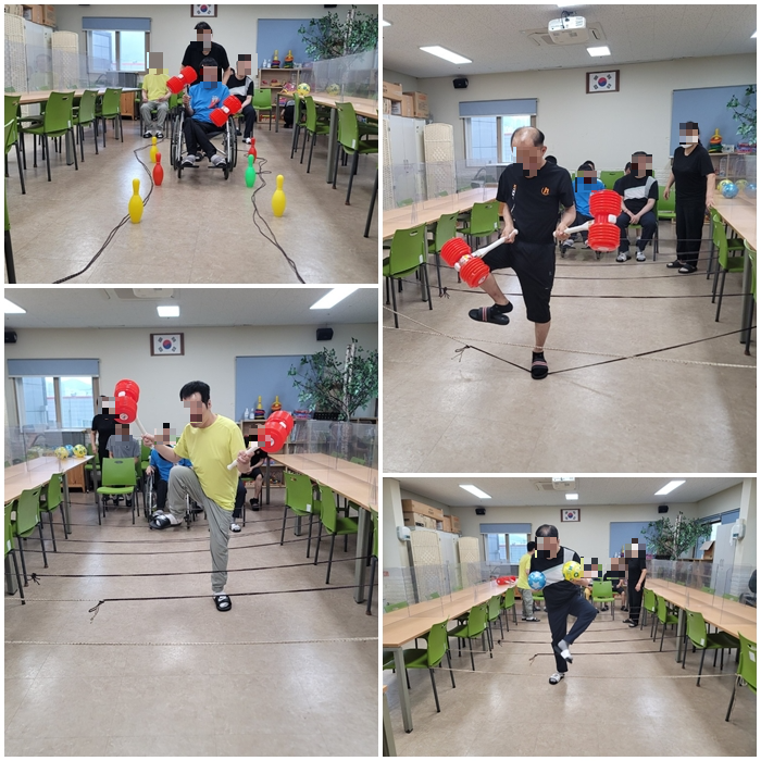신체활동의 일환으로 고무줄을 발로 밟으며 한칸씩 앞으로 전진하면 되는 활동인데 단순해 보이는 동작이지만 보시는 것보다는 쉬운 활동은 아닙니다 ^^ 바로 양손에 뿅망치와 공을 들고 지나가야 하기에 균형도 중요하게 생각해야 된다는 사실 ~!!