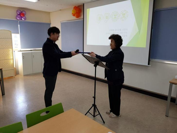 1주년 기념행사가 끝난 후에는 종사자를 대상으로 윤리강령 선언식을 진행하였습니다. 강사로는 시설장이신 이금주 원장님이 교육을 진행하여 주셨으며 인혜원의 윤리규범에 대해 알아보고 윤리강령 선언식 까지 진행하였습니다. ^^
