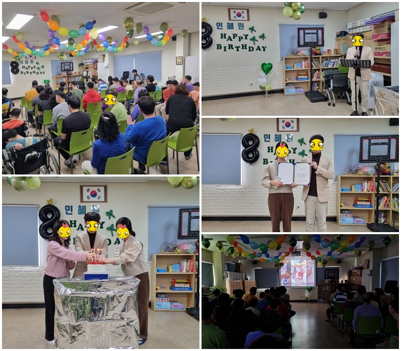 2025년 2월 28일(금) 인혜원 개원 8주년을 맞아 입주자와 종사자가 한자리에 모여 개원 기념 행사를 진행하였습니다. 2017년도를 시작으로 벌써 8년이라는 세월이 흘렀는데 멀리서나마 인혜원을 지지하고 후원해주시는 모든 분들께 감사의 인사를 전합니다. 감사합니다.